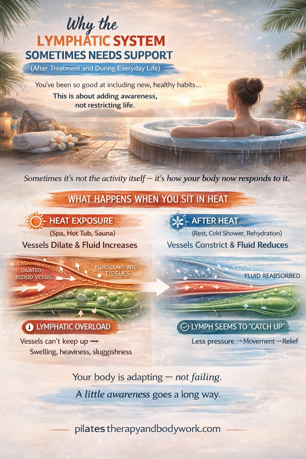 Clinical guidance for people at risk of lymphoedema often advises caution with prolonged heat exposure, as it may increase swelling in some individuals.