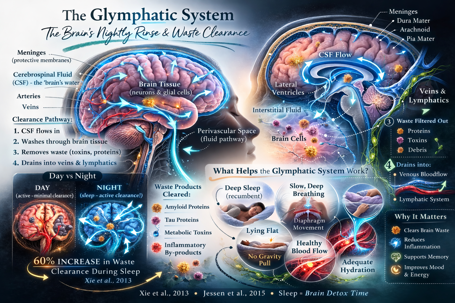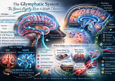 One of the most well-known studies (Xie et al., 2013) found that the space between brain cells increased during sleep, allowing fluid to move more freely and clear waste — with around a 60% increase in clearance activity.